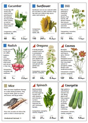 This includes 8 plant cards, cucumber, sunflower, dill, radish, oregano, cosmos, spinach and one animal card (mice).
